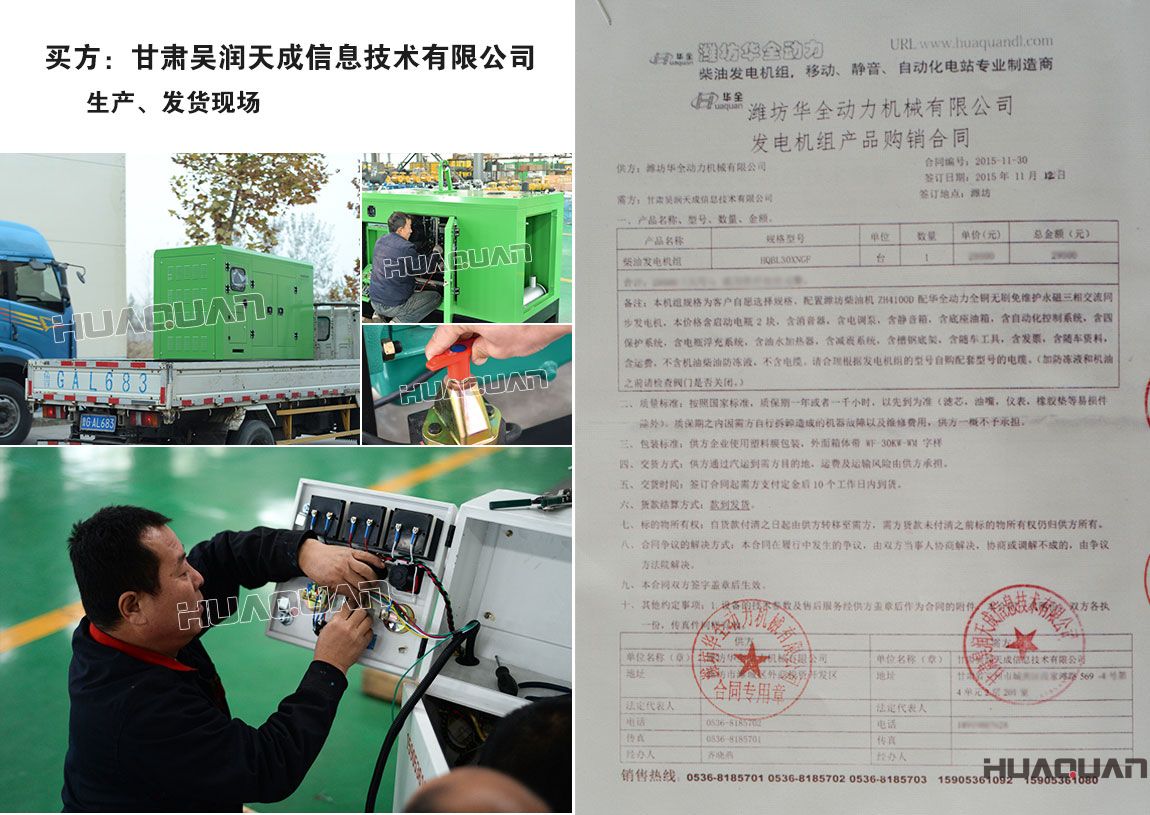 作為信息技術公司離不開電力的支持。為了避免因缺電、停電而造成的經(jīng)濟損失。甘肅吳潤天成信息技術有限公司在2014年8月30日、2015年11月12日分別在華全動力采購一臺柴油發(fā)電機組。