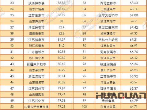 從排名情況看,前四名與去年相比沒有任何變化。去年排名第8的晉江上升3個位次,今年排在第5位,去年排名第5位的宜興則后退一個位次,內(nèi)蒙古的準(zhǔn)格爾旗則在今年 擠進(jìn)前十。